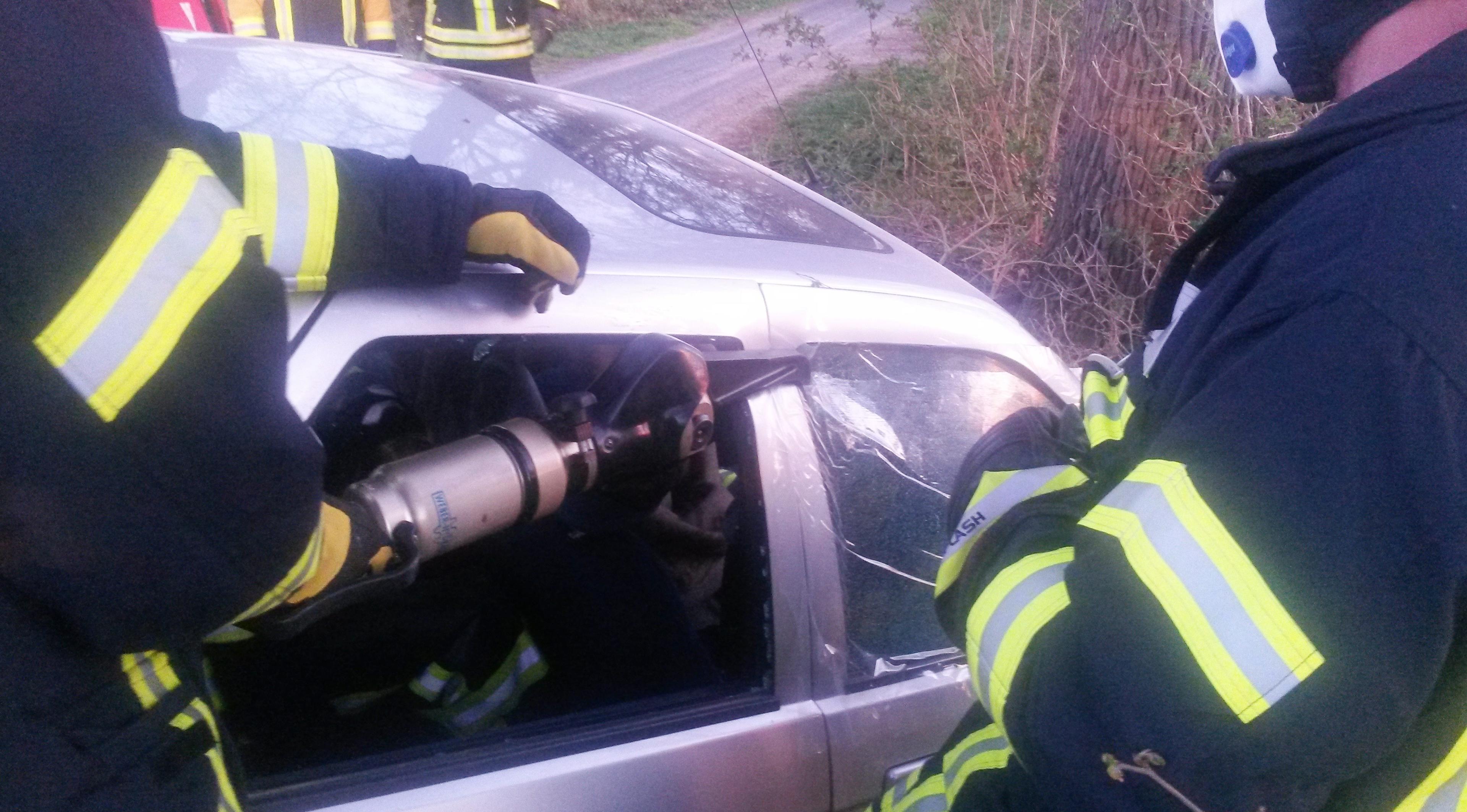 Zu einem Übungseinsatz Verkehrsunfall mit eingeklemmter Person rückte gestern abend die Löschgruppe Till-Moyland mit beiden Fahrzeugen zur Alten Moyländer Allee aus. Dort war ein Pkw beim Befahren der schmalen Straße von dieser abgekommen, hatte eine Strauchreihe durchbrochen und war rechts neben der Fahrbahn in der unbefestigten Bankette unmittelbar neben einem Baum zum Stehen gekommen. Der Fahrer war nicht ansprechbar und im Fahrzeug eingeklemmt.