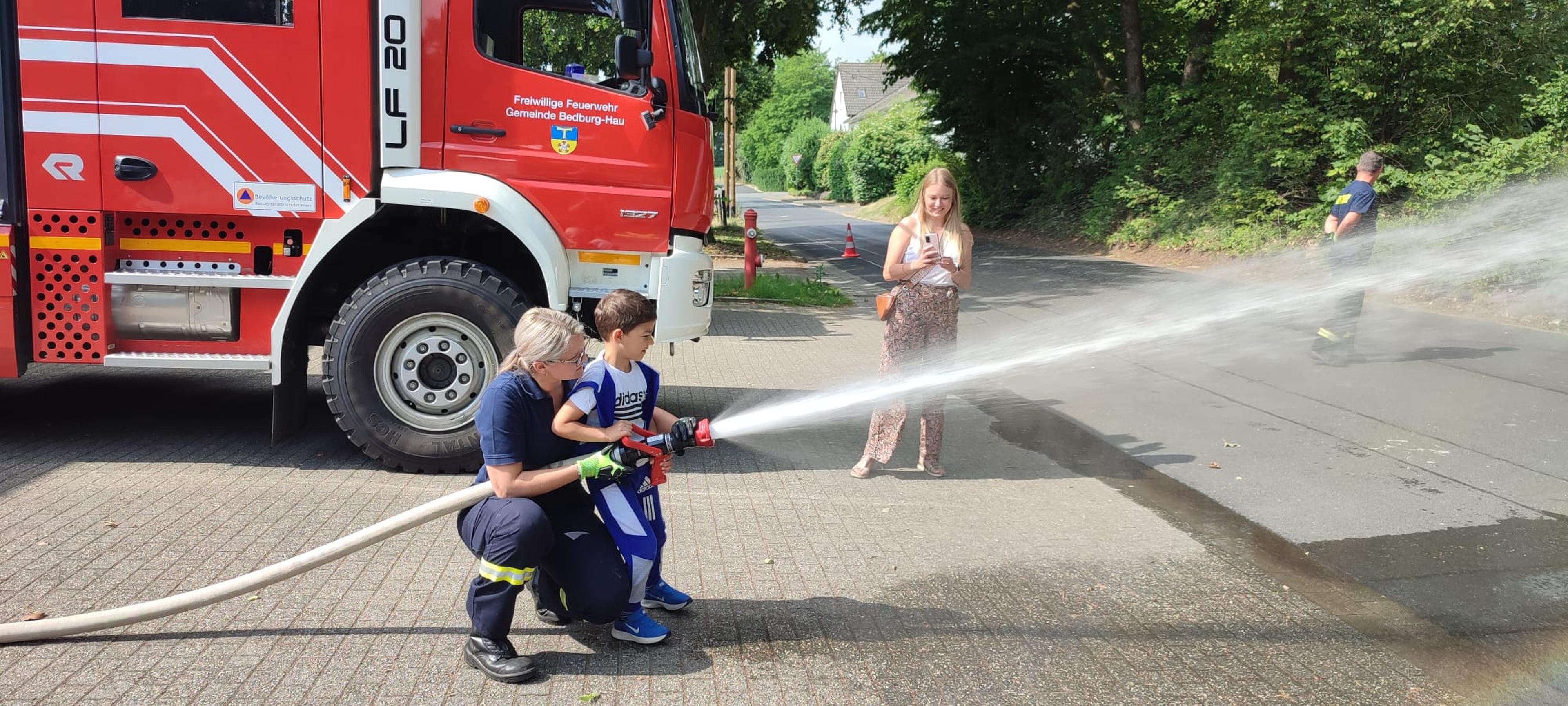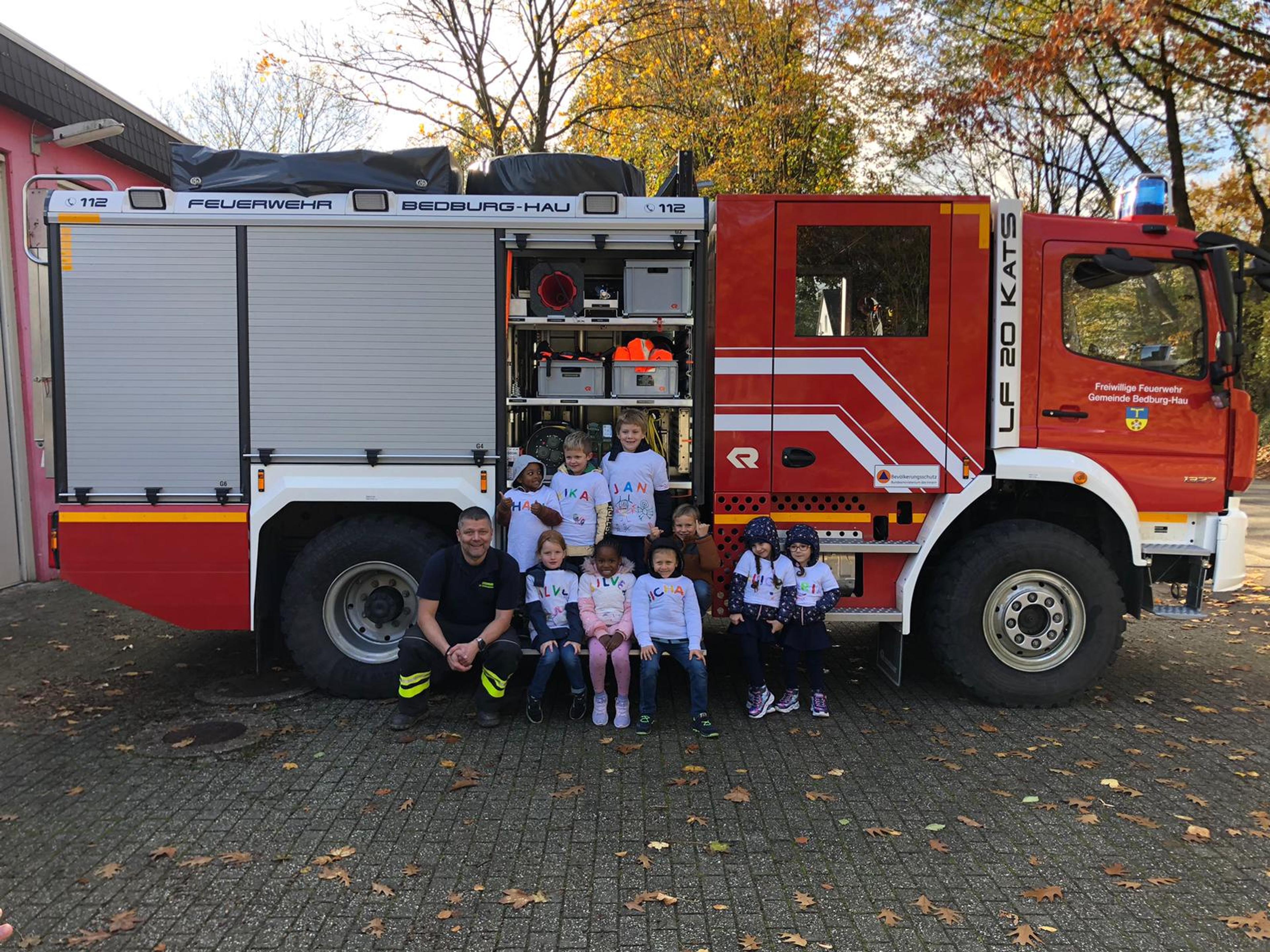 Ehrenamtlich unterstützt die Freiwillige Feuerwehr Bedburg-Hau seit Jahren alle Erzieher:innen in den Kindertageseinrichtungen der Gemeinde bei den Themen Feuer, Notruf oder dem Verhalten im Brandfall. In gemeinsamen Projekttagen für Vorschulkinder wird den Kindern beigebracht, wie ein Brand vermieden werden kann, oder wie man einen Notruf absetzt.