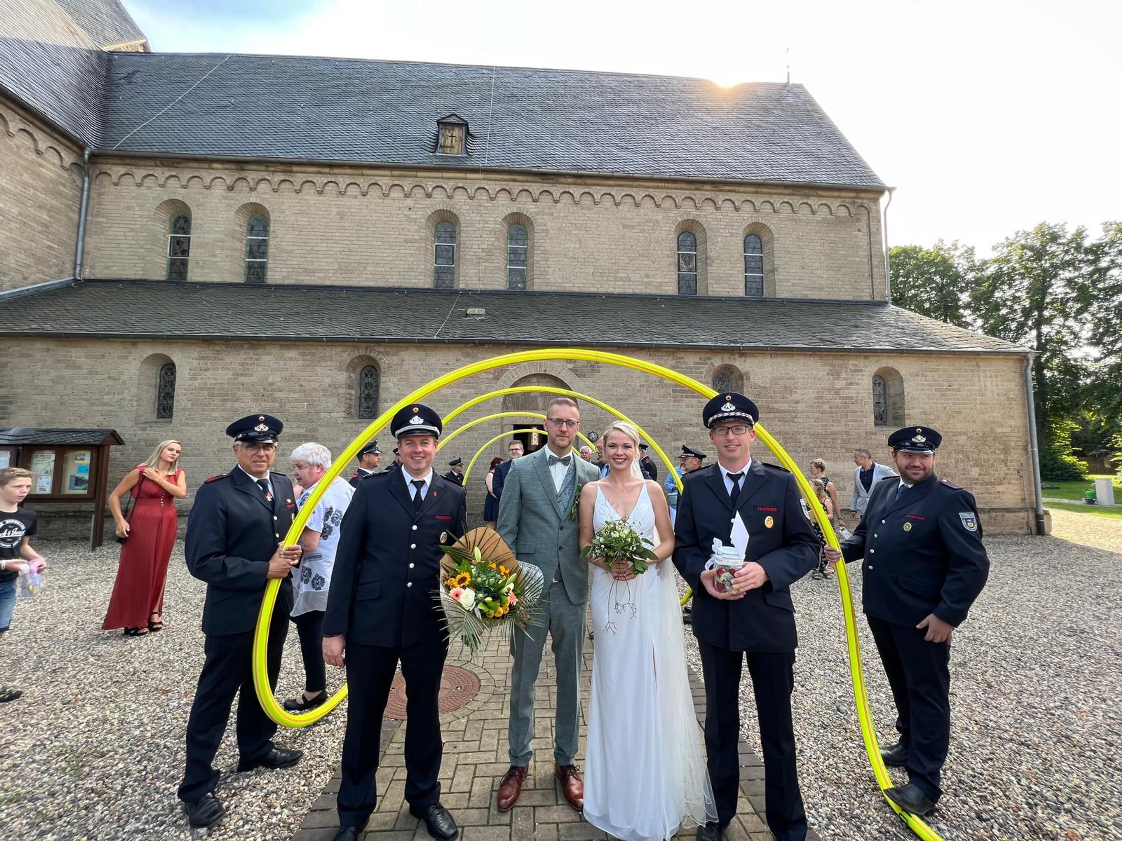 Anlässlich der standesamtlichen Hochzeit von Annalena und Michael Erren bildeten heute die Kamerad:innnen der Einheit Schneppenbaum einen Ehrenspalier vor dem Rathaus in Schneppenbaum.