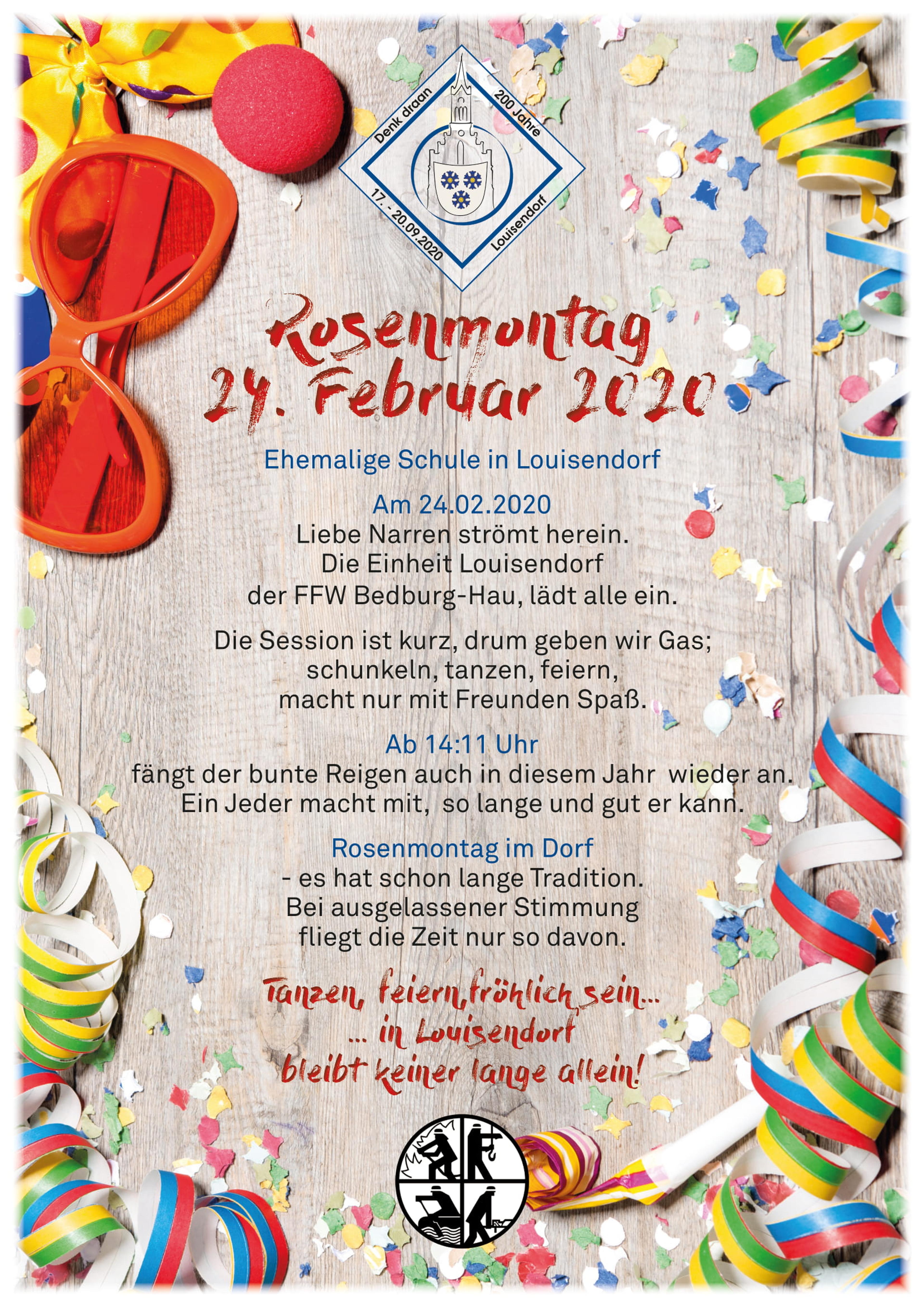 Unter dem Motto "Tanzen, feiern, fröhlich sein ... in Louisendorf bleibt keiner lange allein!" startet auch die Freiwillige Feuerwehr Bedburg-Hau in die fünfte Jahreszeit. Ansonsten Retten, Löschen, Bergen und Schützen sie an 365 Tagen und sind rund um die Uhr für Bedburg-Hau im Einsatz. Freiwillig.