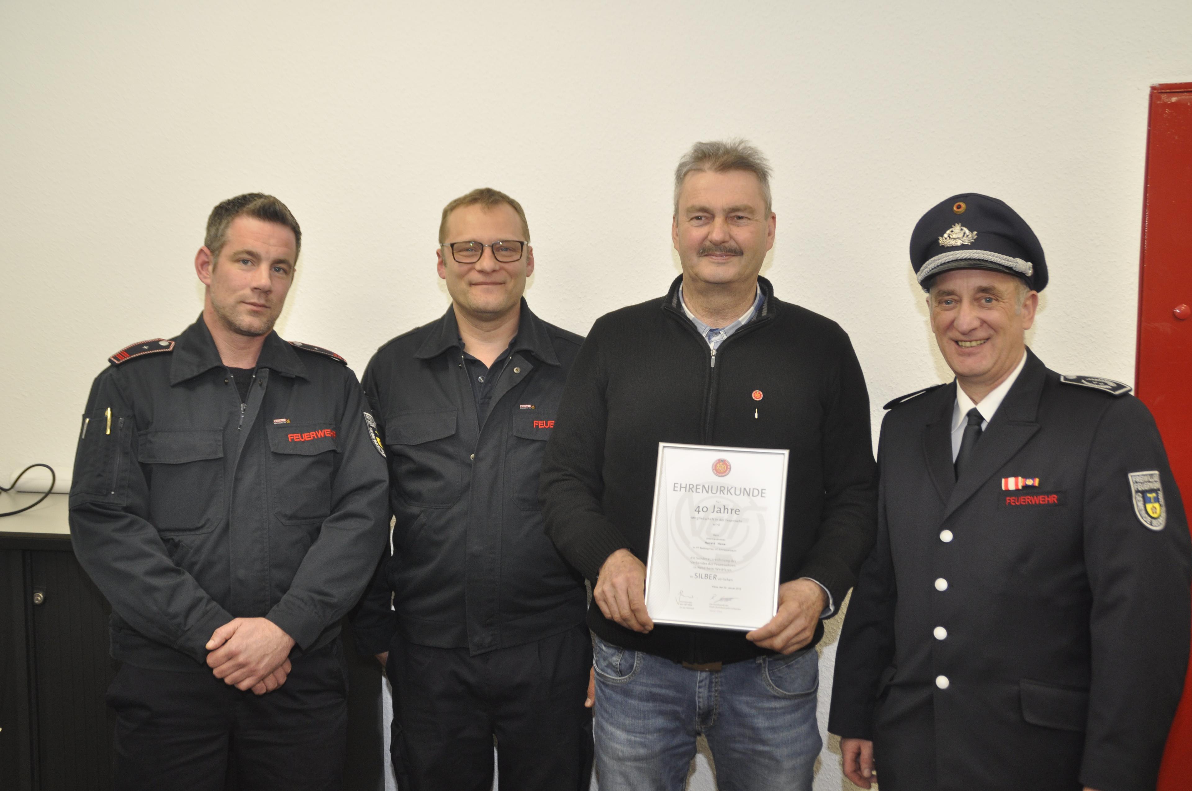 Der Leiter der Feuerwehr Stefan Veldmeijer und die Einheitsführer Christoph Howald und Björn Grajewski haben im Rahmen eines Dienstabends Unterbrandmeister Harald Hans geehrt. Sie überreichten Harald "Harry" Hans für seinen 40-jährigen Feuerwehrdienst das Ehrenzeichen des Verbandes der Feuerwehren NRW (VdF).